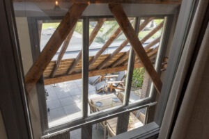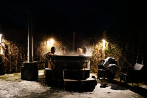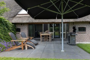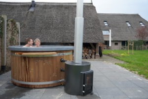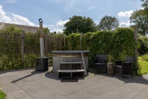 De vakantieboerderij is verder voorzien van een binnen terras en aansluitend een buiten terras. Heerlijk genieten onder de rieten kap met uitzicht over de enorme tuin met poel. Fietsen en/of motoren kunnen afgesloten en droog geparkeerd worden. Nieuw is de hout gestookte hottub, Heerlijk genieten in de grote tub met uitzicht over de tuin en de landerijen ! De tub is optioneel en kunt u reserveren.