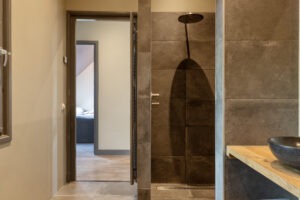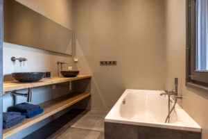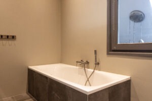 Er is een badkamer met regendouche/handdouche, ligbad, en twee waskommen. Naast de badkamer een tweede toilet.
